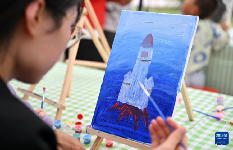4月24日,观众在文昌航天科普中心进行航天主题画创作。