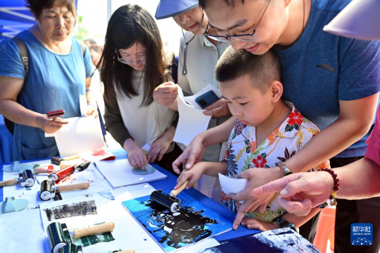 4月24日,小朋友和家长在文昌航天科普中心制作航天主题版画。