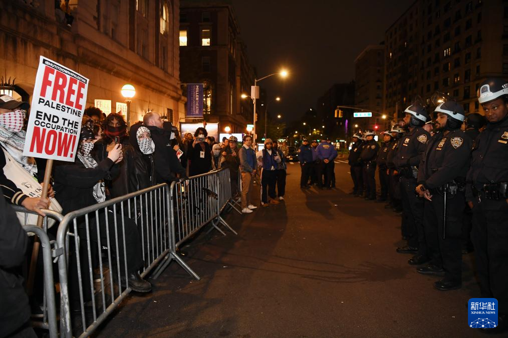 4月24日凌晨,在美国纽约市哥伦比亚大学,抗议者与警察对峙。 连日来,包括纽约市哥伦比亚大学在内的数所知名美国高等学府爆发示威,要求加沙地带永久停火、美国停止军事援助以色列。 新华社记者 李睿 摄