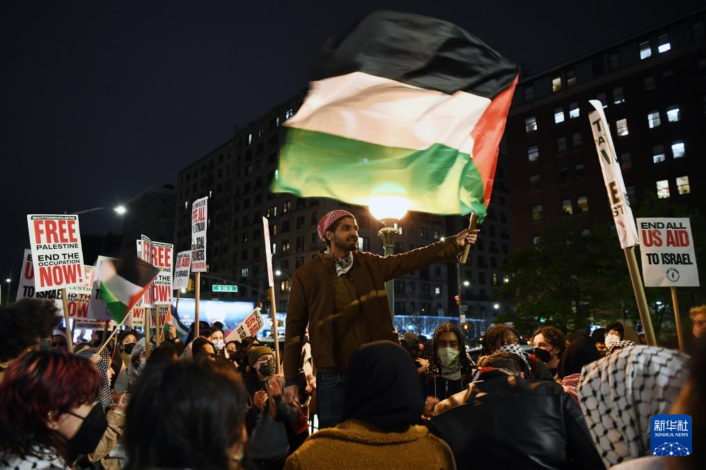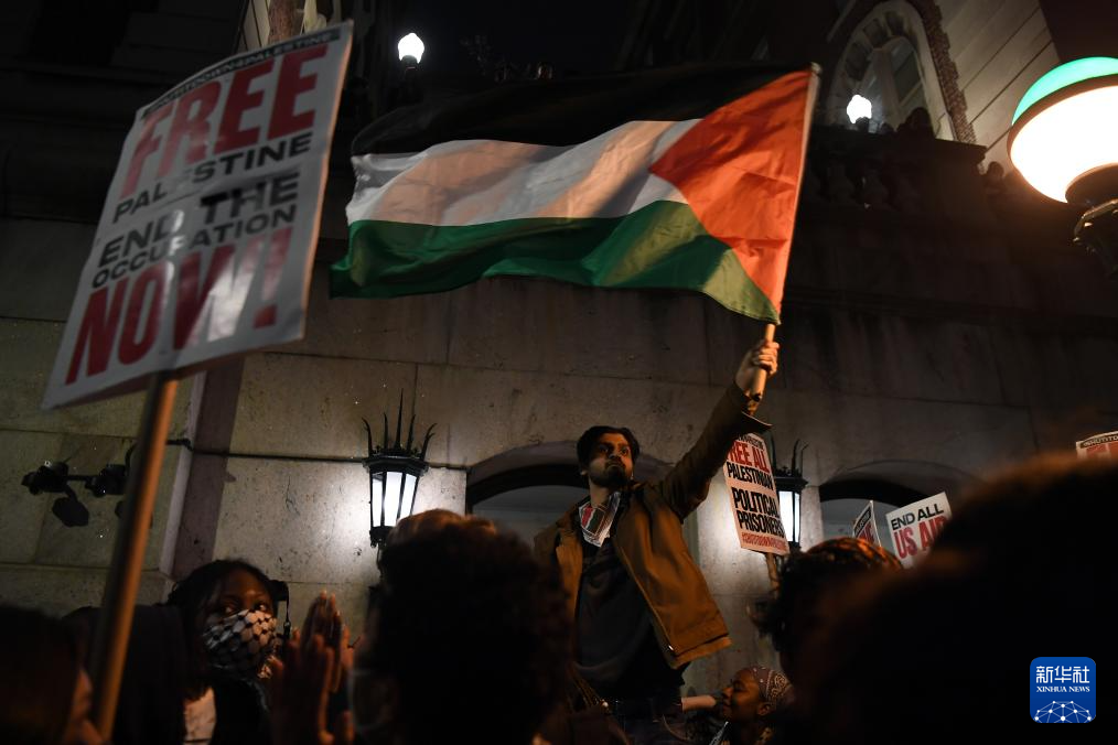 4月24日凌晨,抗议者在美国纽约市哥伦比亚大学参加示威活动。 连日来,包括纽约市哥伦比亚大学在内的数所知名美国高等学府爆发示威,要求加沙地带永久停火、美国停止军事援助以色列。 新华社记者 李睿 摄