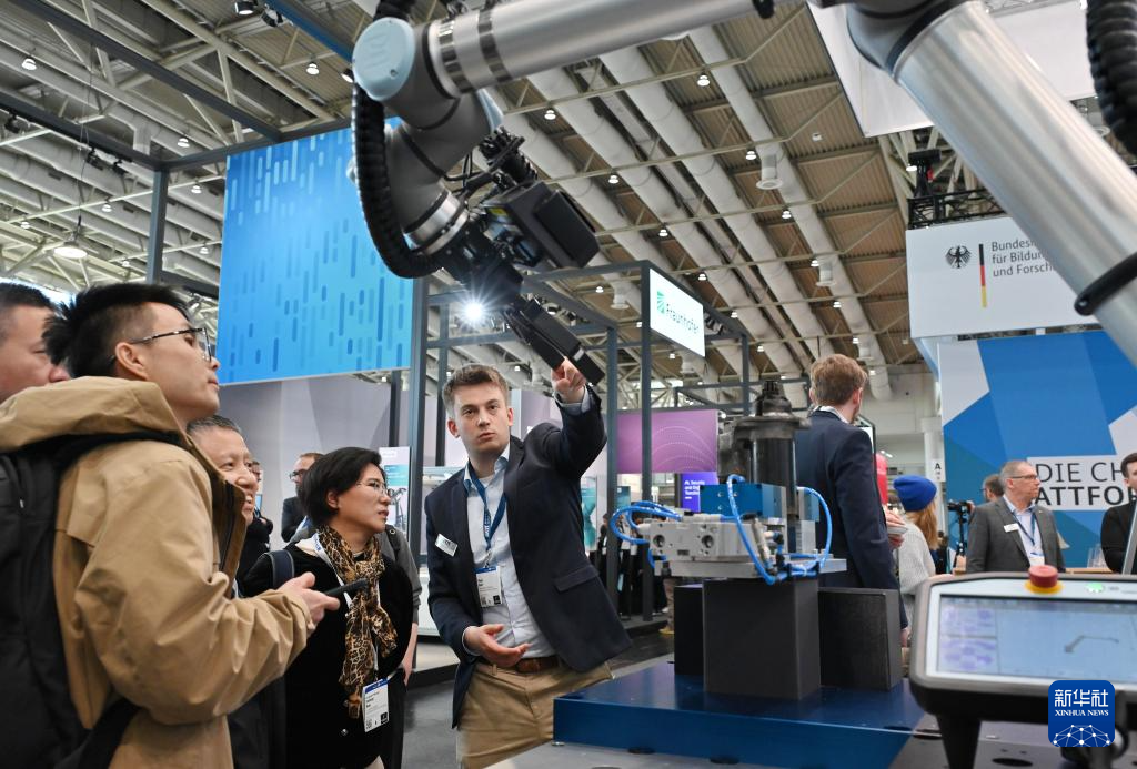 4月22日,人们在德国汉诺威工博会上参观一款智能机械臂。