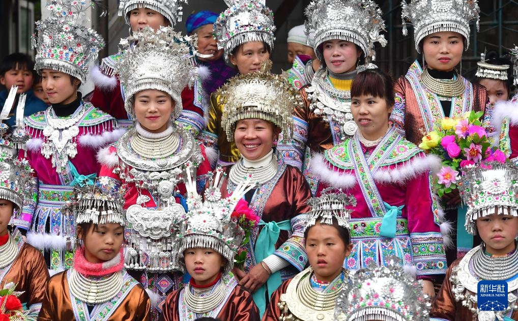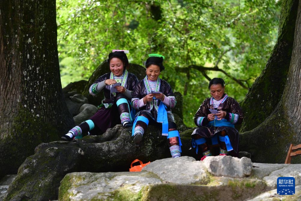 乌英苗寨妇女梁足英(左一)和姐妹们在亮布文化节上展示亮布及服饰(2020年10月25日摄)。 新华社记者 黄孝邦 摄