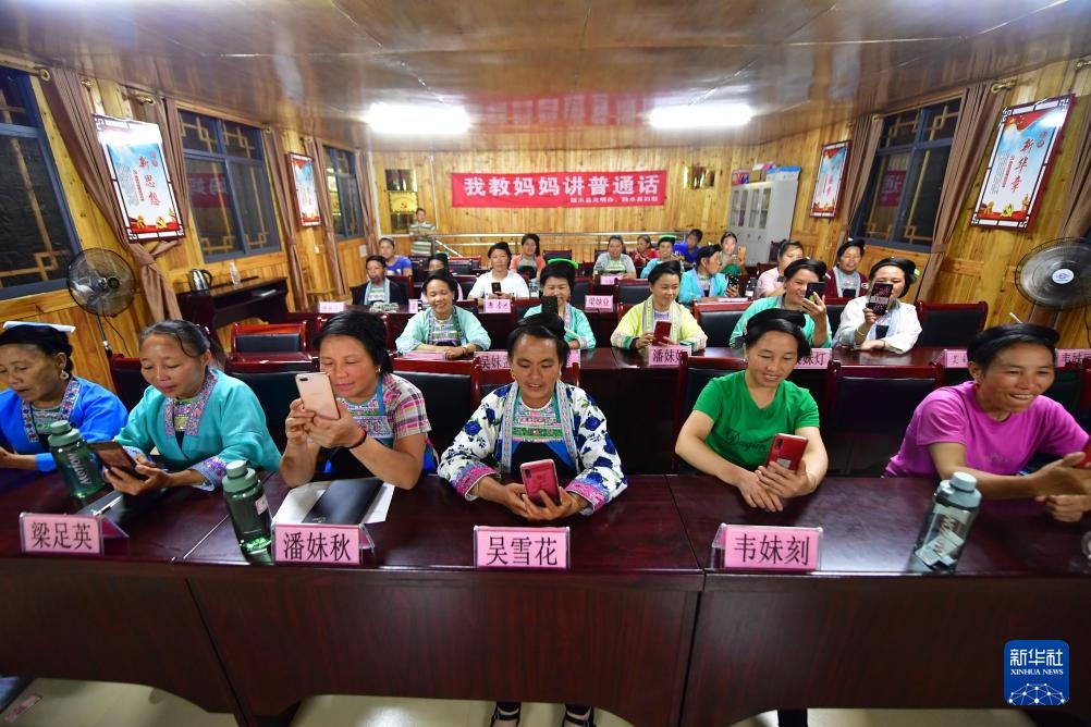 在乌英苗寨,梁足英(前排左二)和寨子里的姐妹们在夜校课堂上用手机记录上课内容(2020年8月11日摄)。 新华社记者 黄孝邦 摄