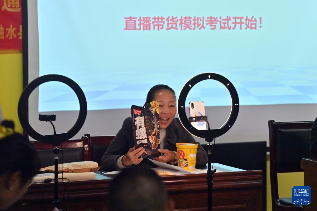 在乌英苗寨,梁足英在学习电商直播技能(2023年3月24日摄)。 新华社记者 黄孝邦 摄