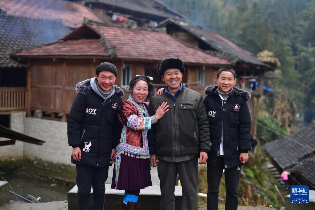 在乌英苗寨,梁足英(左二)和丈夫、儿子合影(2019年2月13日摄)。 新华社记者 黄孝邦 摄