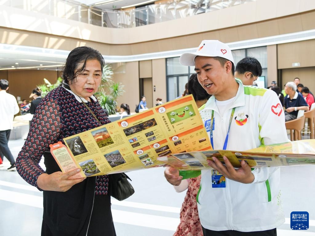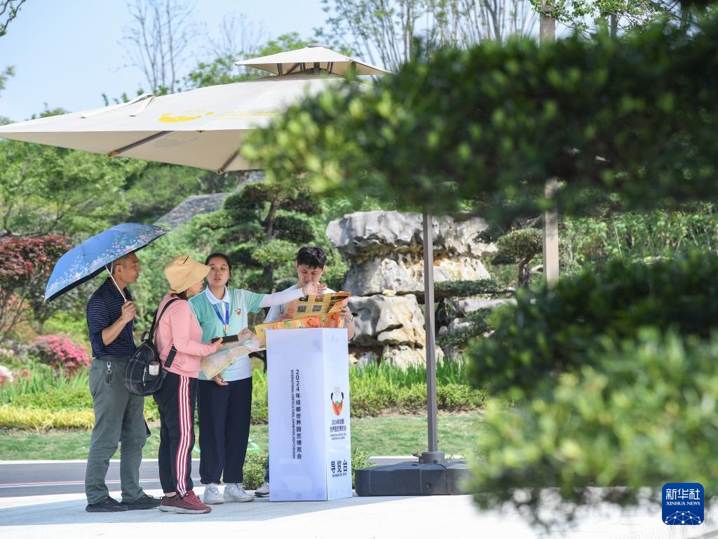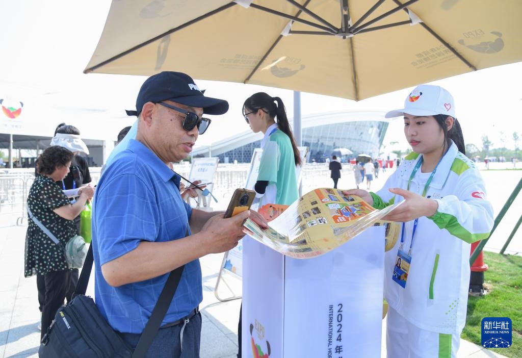 4月27日,在成都世园会主会场综合服务馆,志愿者为游客发放园区导览图。