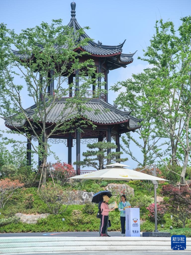 4月27日,在成都世园会主会场成都园,志愿者为游客提供引导服务。