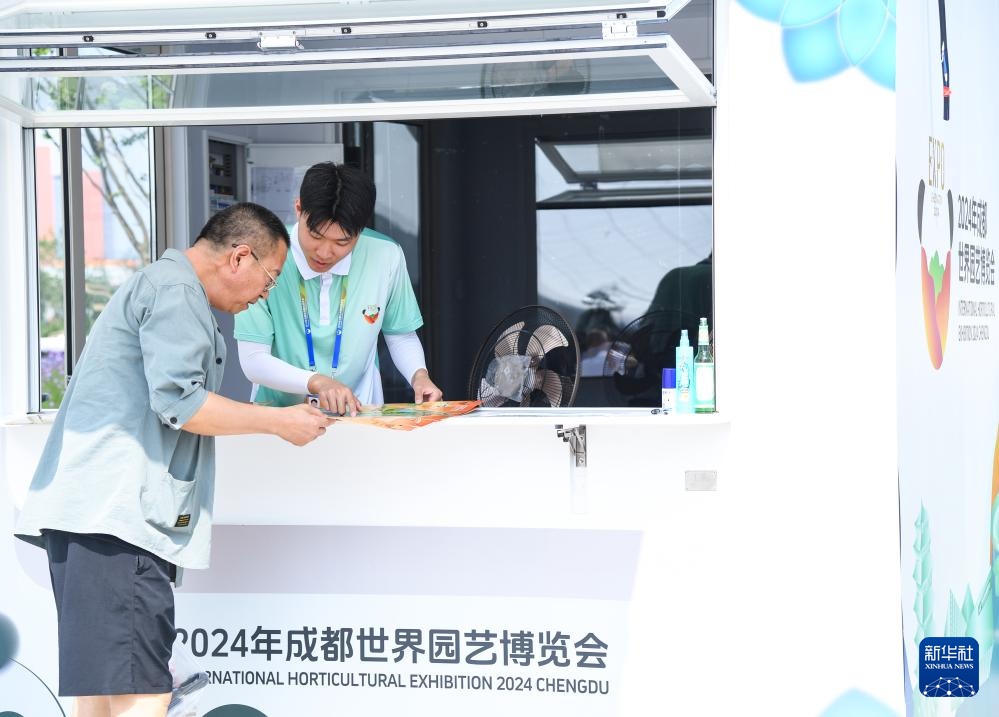 4月27日,在成都世园会主会场志愿者服务小站,志愿者在解答游客问询。