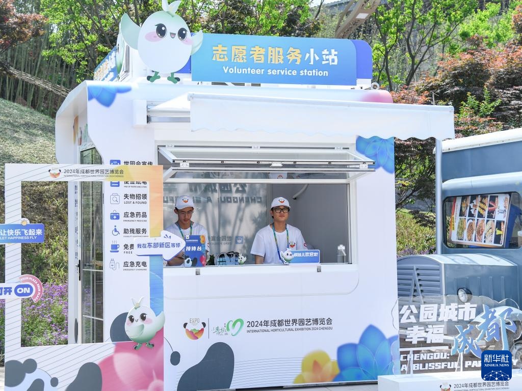 这是4月27日在成都世园会主会场拍摄的志愿者服务小站。