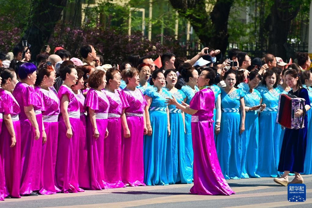 这是4月30日在新疆乌鲁木齐市举行的巡游活动上拍摄的手风琴演奏及合唱表演。