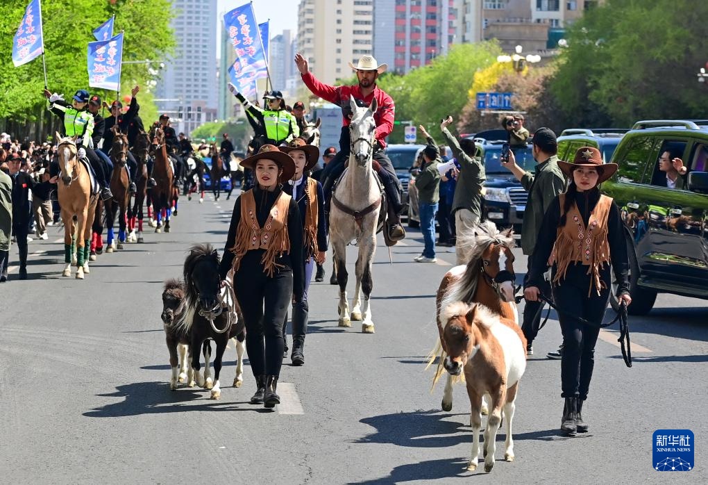 4月30日,在新疆乌鲁木齐市举行的巡游活动上,汗血宝马方阵为观众带来马术表演。