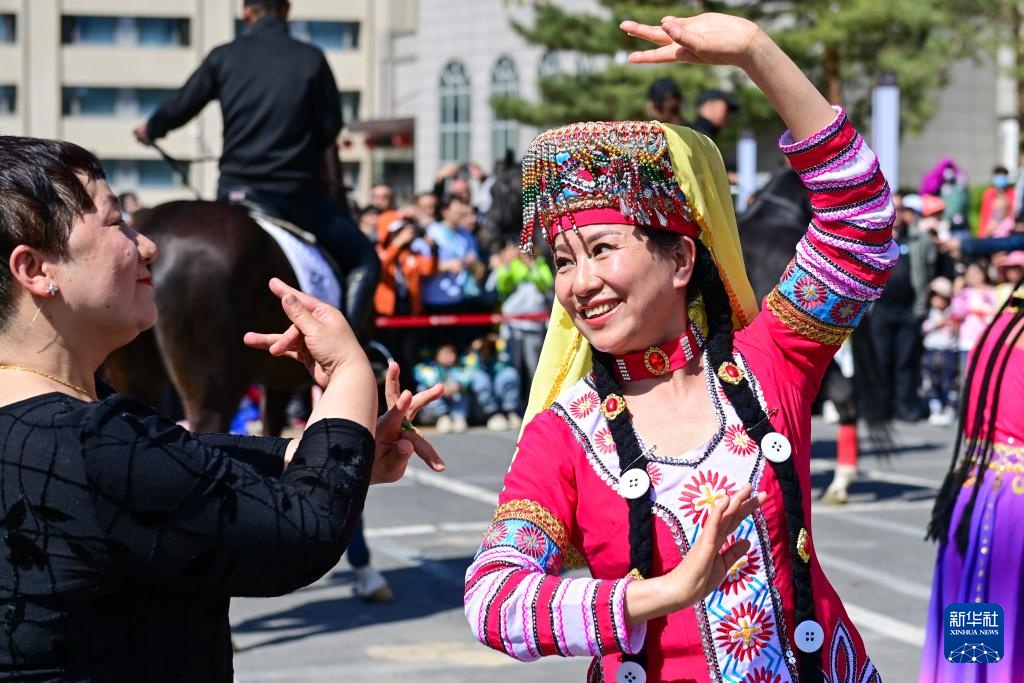 4月30日,在新疆乌鲁木齐市举行的巡游活动上,市民和游客一起跳麦西来甫。