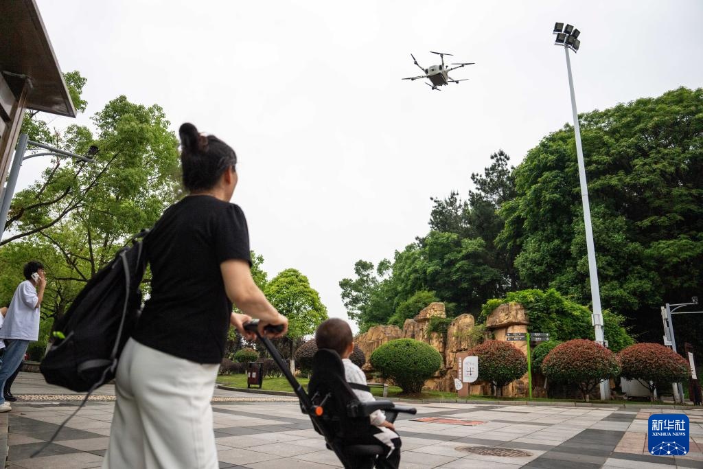 5月7日,在长沙县一街边公园,市民观看装有货品的无人机降落。