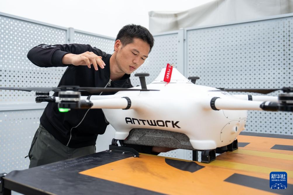 5月7日,在长沙县一街边公园,安全员给无人机更换电池(无人机照片)。