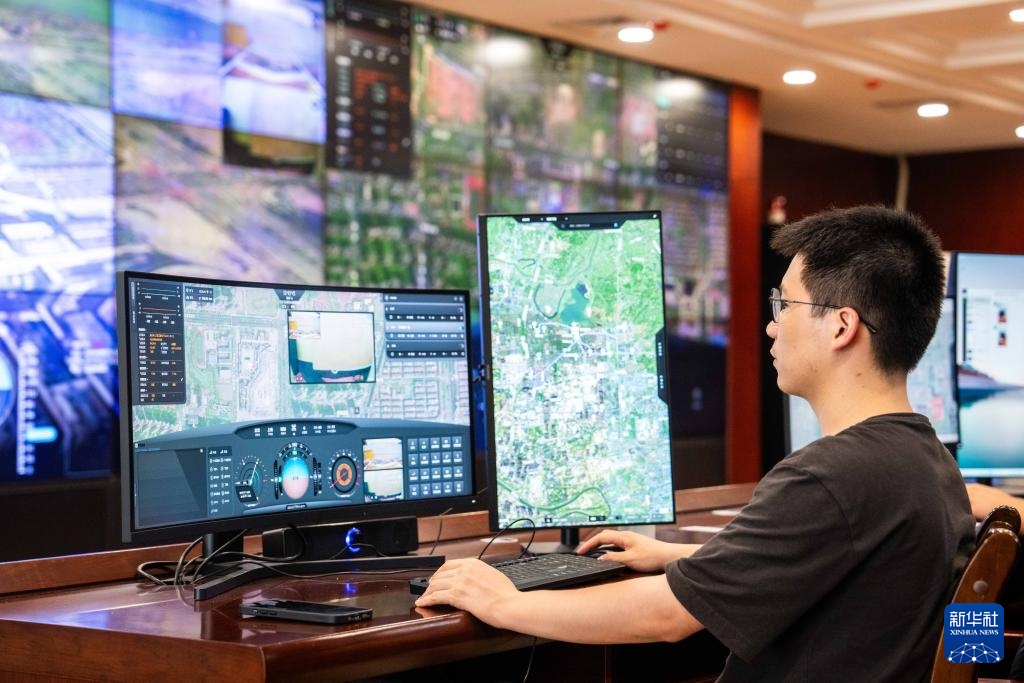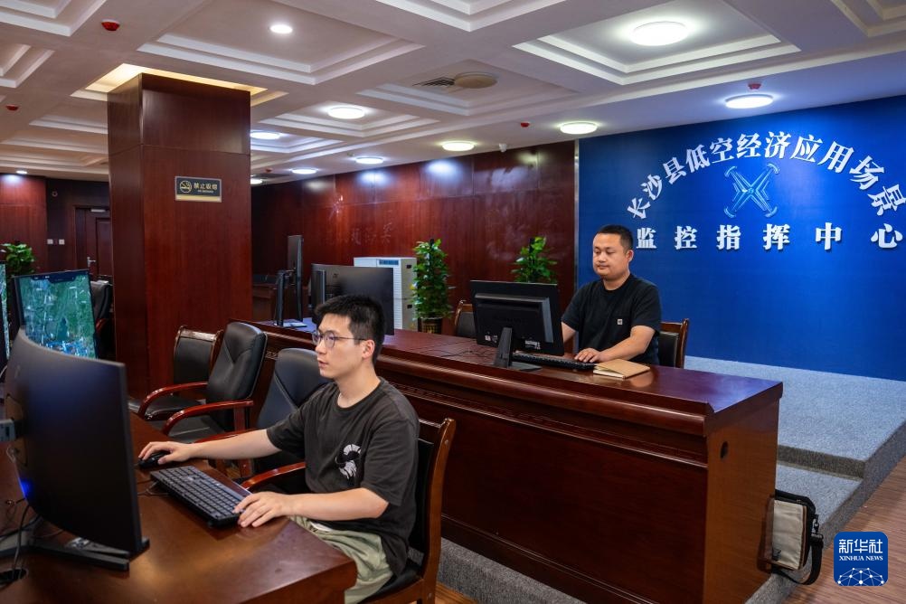 5月7日,在长沙县低空经济应用场景监控指挥中心,技术人员在远程控制无人机起降和监控飞行安全。