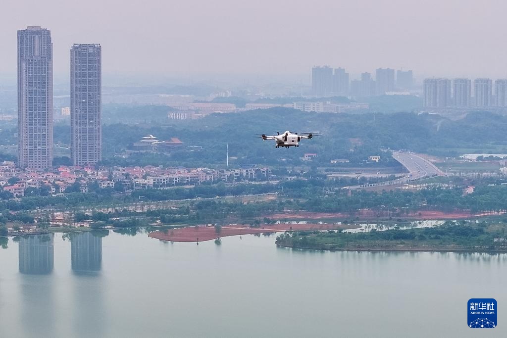 5月7日,一台装有货品的物流无人机在长沙县上空飞行中(无人机照片)。