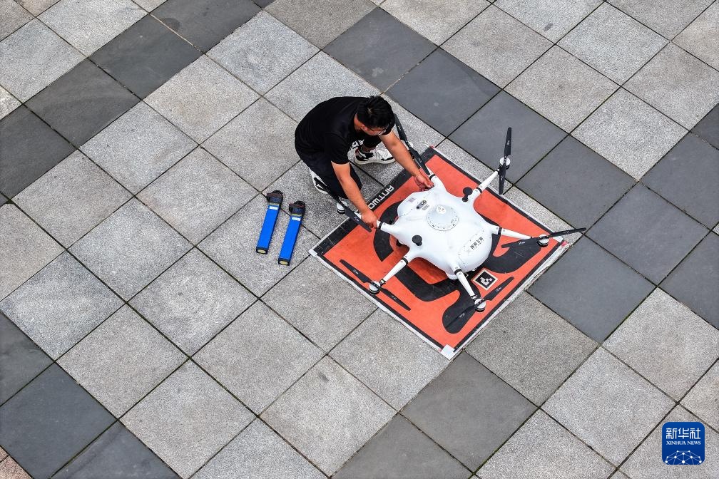 5月7日,在长沙县吾悦广场天台,安全员装入货品后给物流无人机拍照告知后台下达起飞指令。