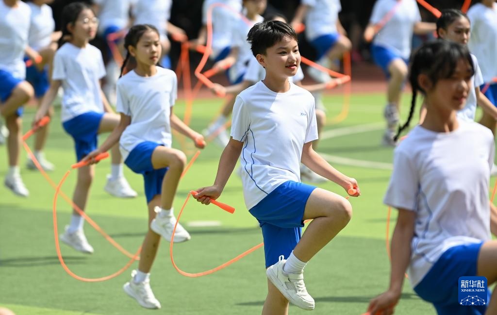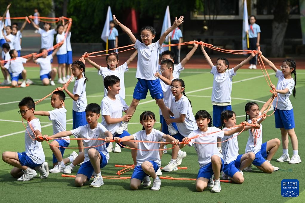 5月7日,西安市新城区后宰门小学的小学生在运动会开幕式上表演跳绳。