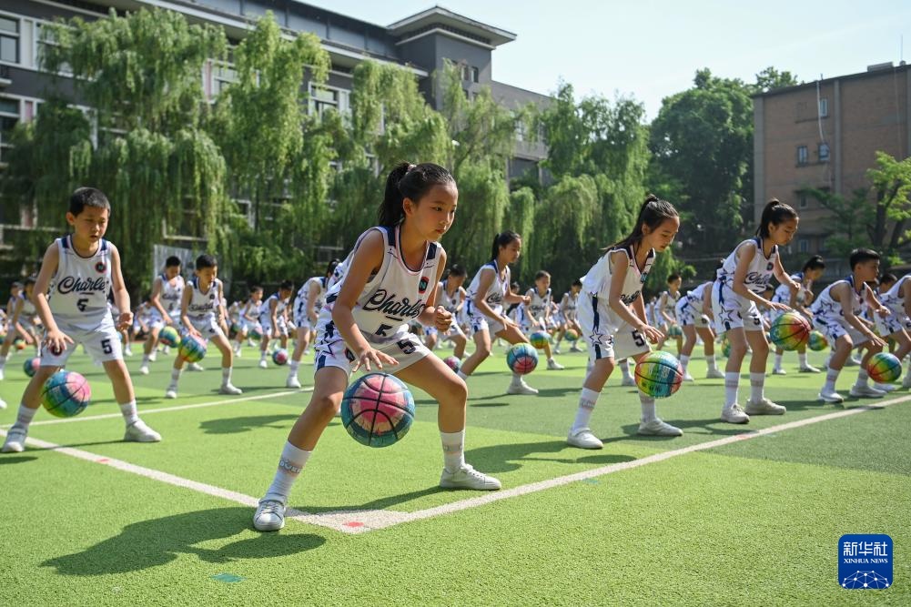 5月7日,西安市新城区后宰门小学的小学生在运动会开幕式上进行篮球表演。