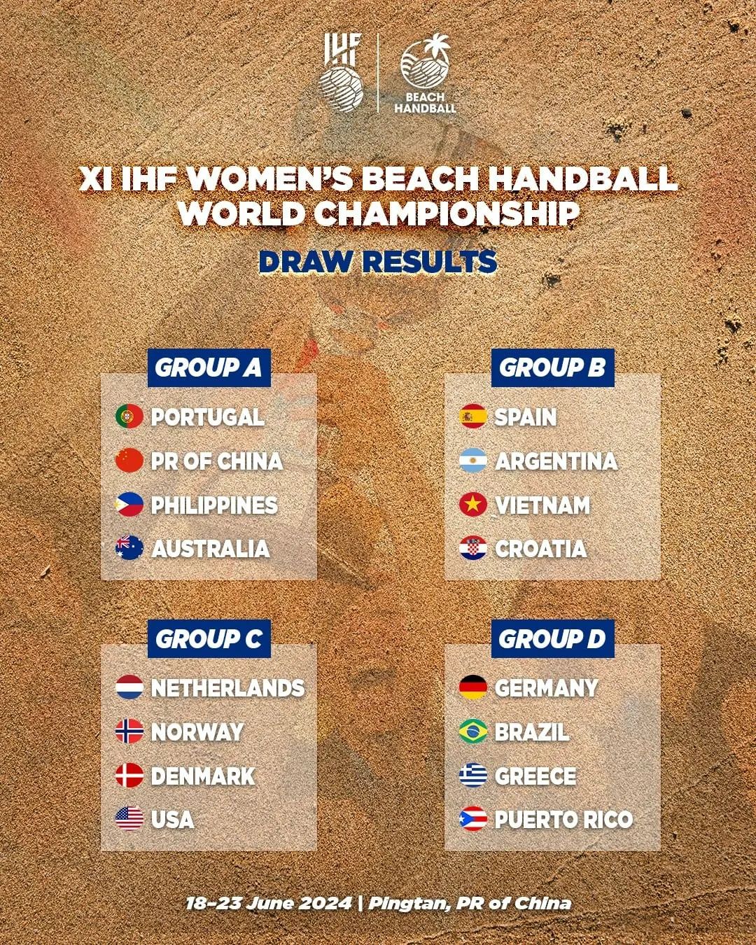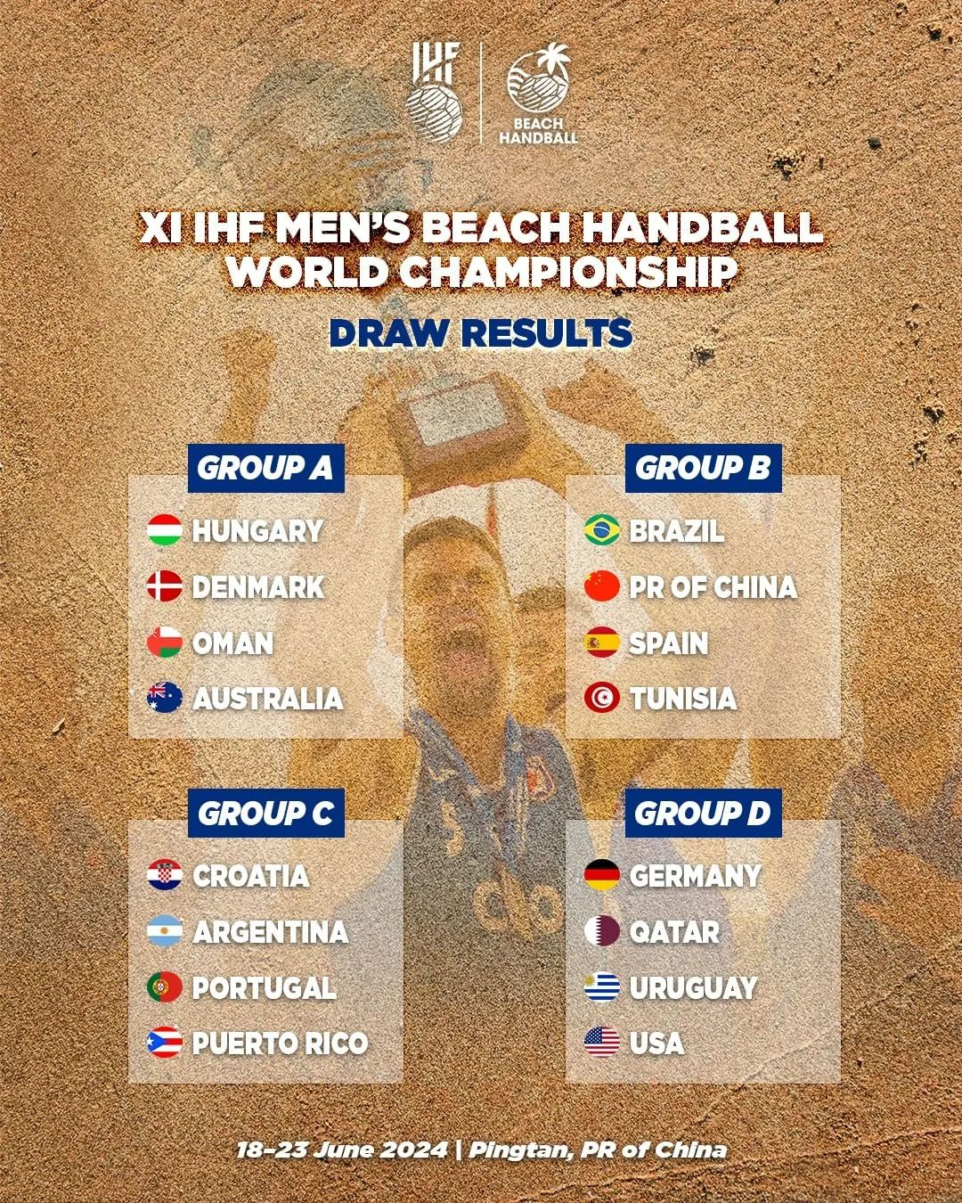 来自全球不同国家的32支男女沙滩手球队伍参赛,分为男女各四个小组进行角逐。