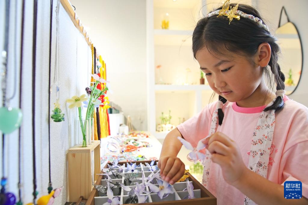5月9日,在淄博市博山区颜神古镇的“石榴王”手造琉璃坊,一名小朋友挑选琉璃首饰。