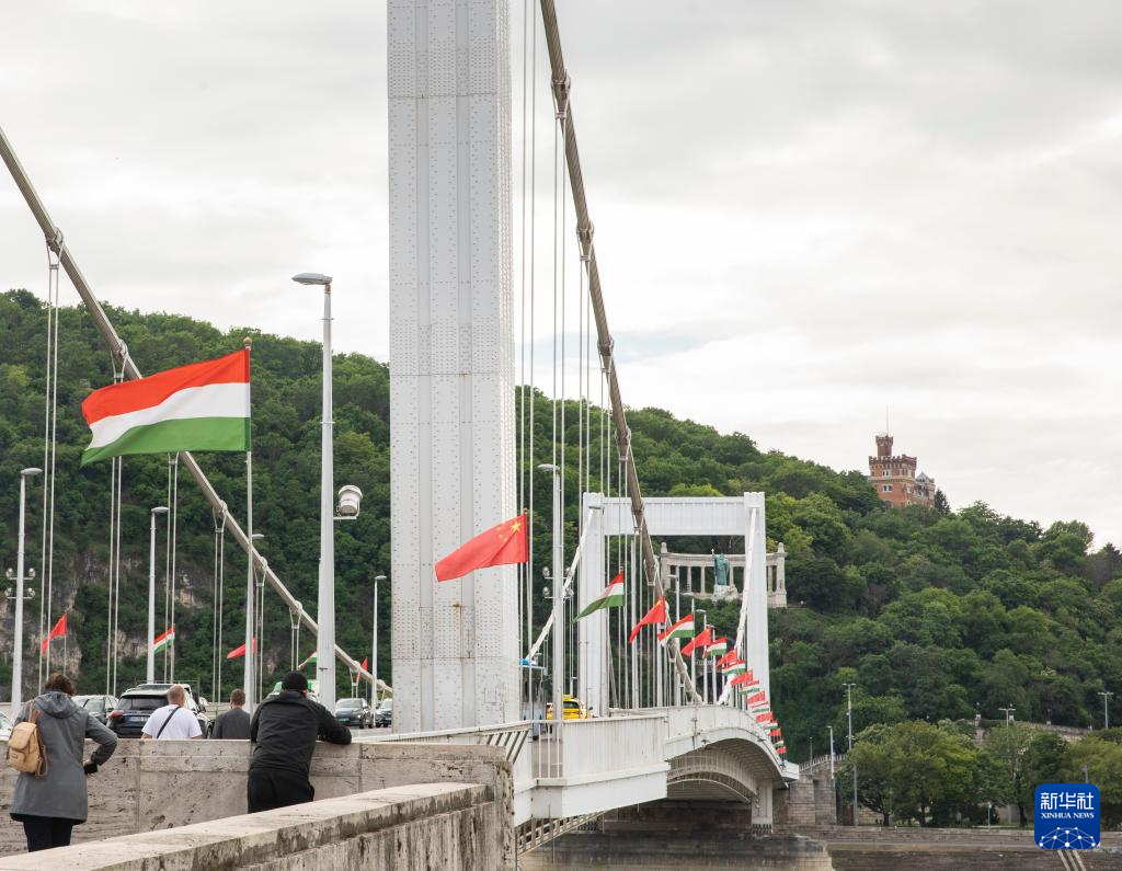 5月8日,中国、匈牙利两国国旗在匈牙利布达佩斯街头飘扬。