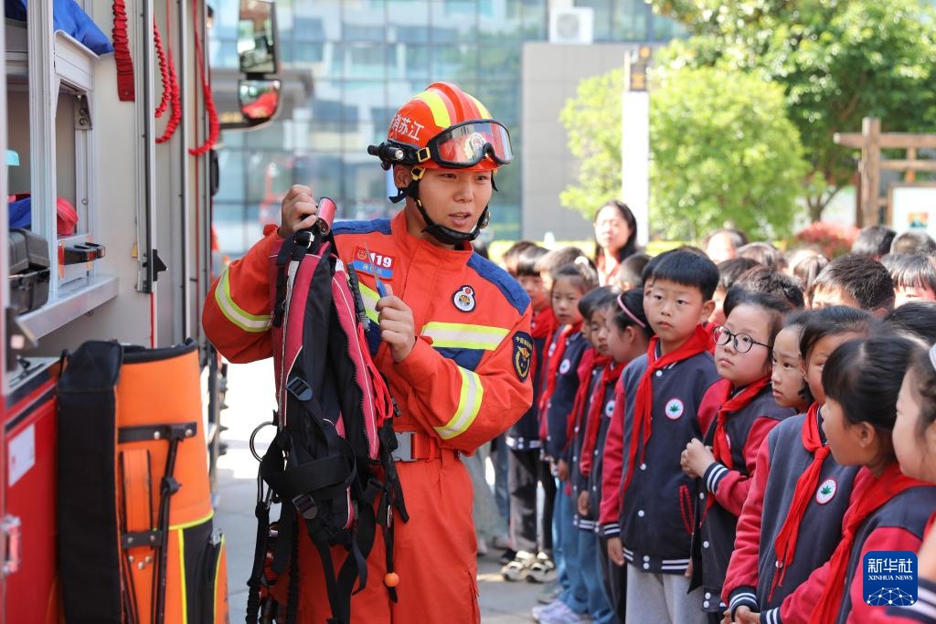 5月10日,在江苏省准安市洪泽城南实验小学,消防员在为学生讲解消防设备知识。