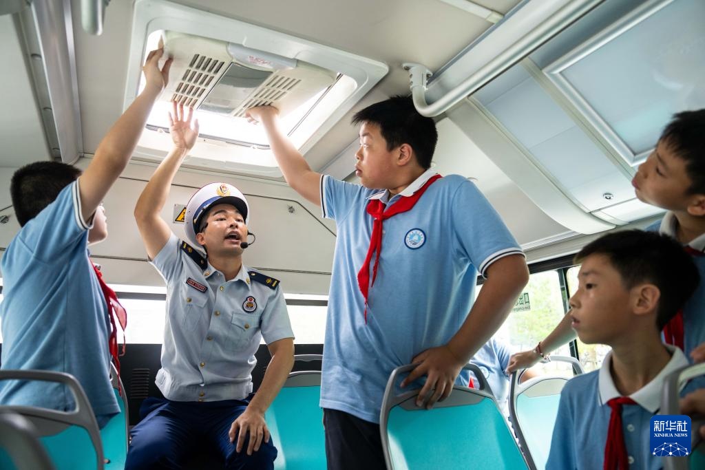5月10日,在湖南省常德市消防救援支队在常德经开区德善学校开展的“校车消防安全教育活动”上,消防员为学生讲解遇险时使用天窗逃生方法。