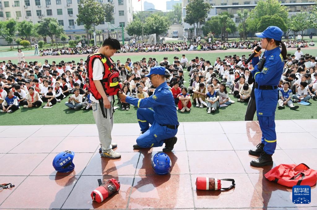 5月10日,在河南省沁阳市李商隐小学,沁阳市蓝天救援队队员为学生讲解、演示救援服正确穿法。