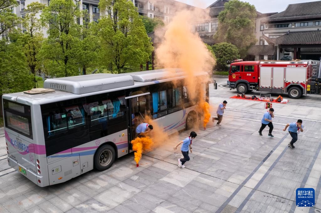 5月10日,在湖南省常德市消防救援支队在常德经开区德善学校开展的“校车消防安全教育活动”上,学生们在进行逃生疏散演习(无人机照片)。