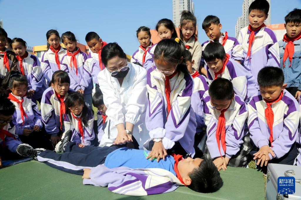 5月10日,在江苏省连云港市院前小学举行的“防灾减灾伴我行”主题教育活动中,学生在校医的指导下学习急救方法。