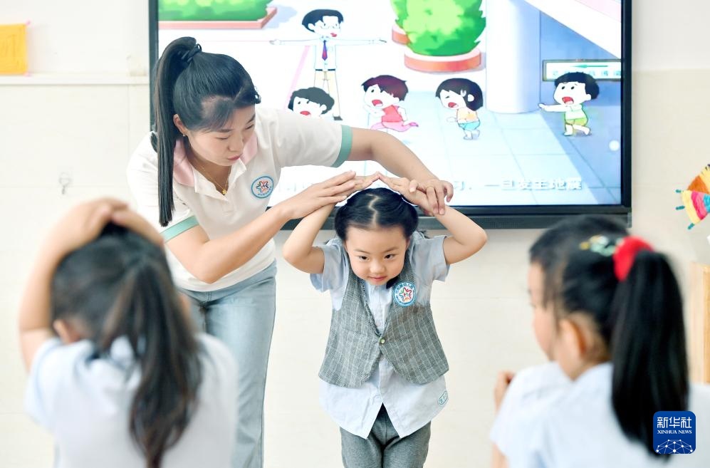 5月10日,在河北省石家庄市长安区盛世之星幼儿园,孩子们在老师带领下学习地震自救知识。