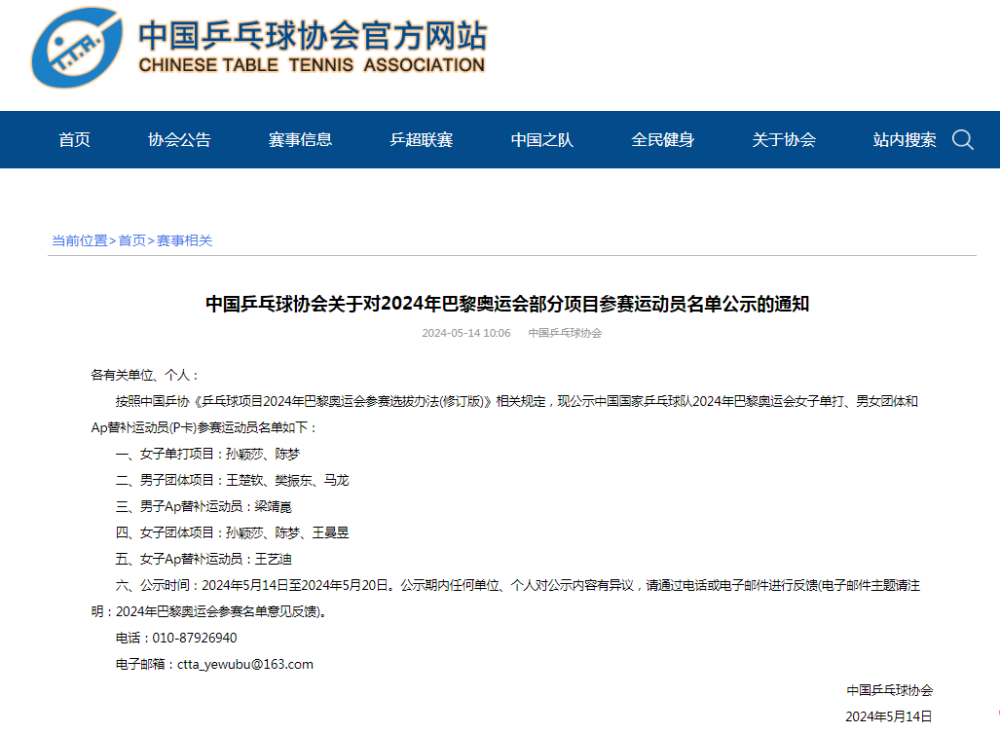 中国乒协公示巴黎奥运会女单、男女团参赛名单