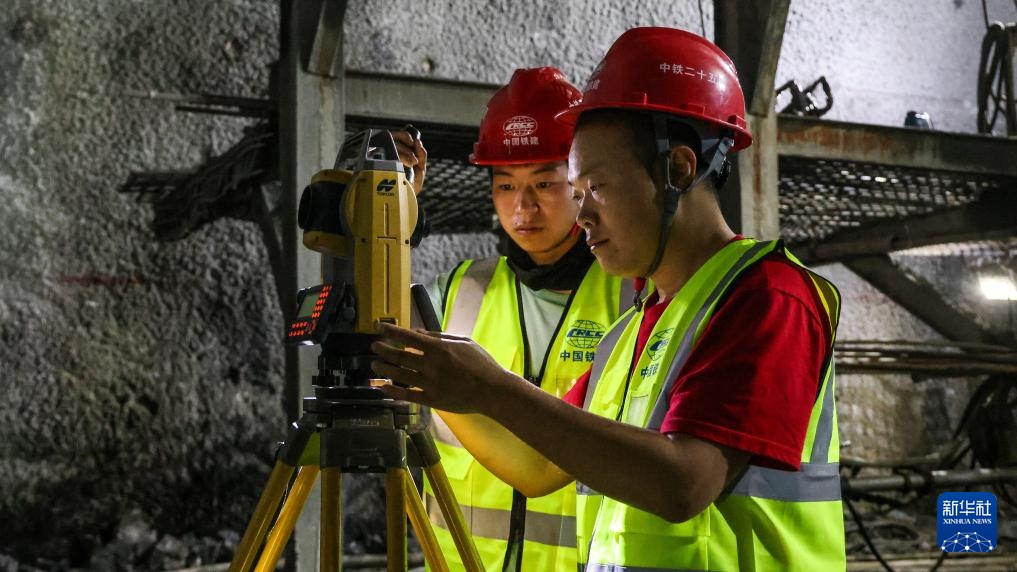 5月14日,六绵山隧道爆破贯通后,技术人员在对隧道的爆破作业面进行测量。