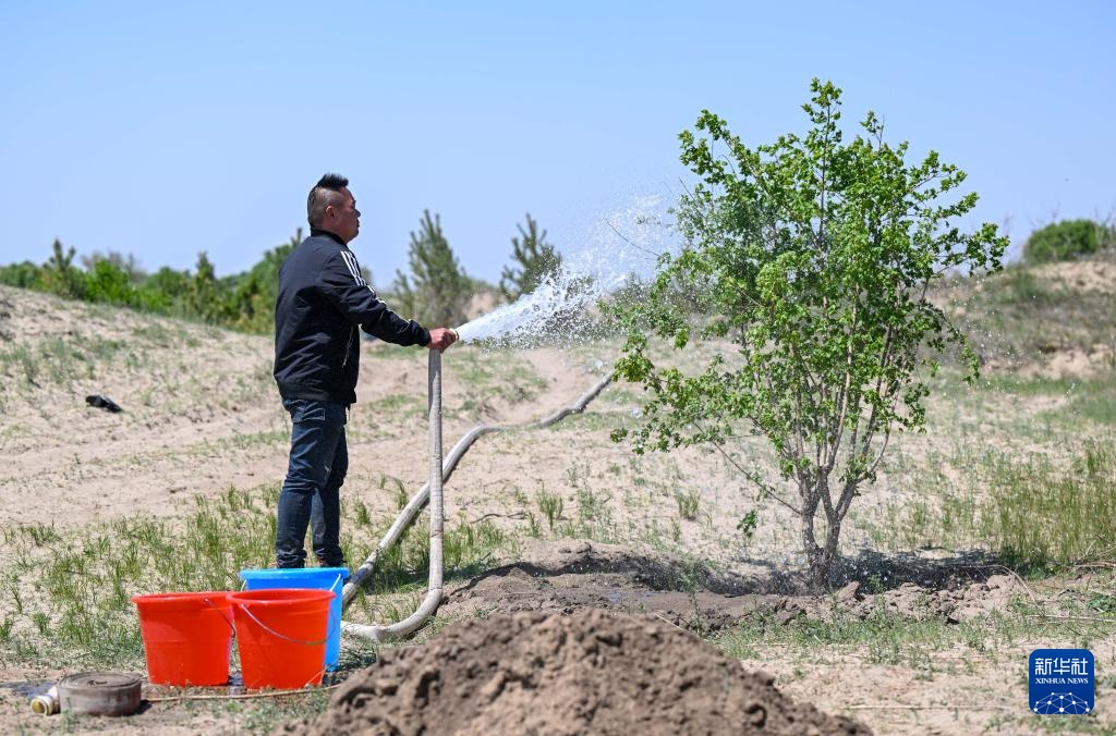 5月15日,在内蒙古通辽市科左后旗甘旗卡镇巴克要系统化治理项目区,工作人员在给树浇水。