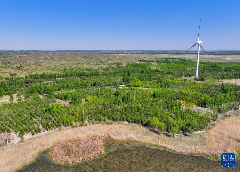 5月15日,在内蒙古通辽市科尔沁沙地“双百万亩”综合治理工程努古斯台项目区,沙地上绿意盎然(无人机照片)。