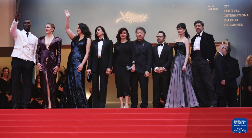 5月14日,在法国南部小城戛纳,主竞赛单元评审团主席、美国电影人格蕾塔·格维希(左二)与众评委一同出席第77届戛纳国际电影节开幕式。 第77届戛纳国际电影节14日晚在法国南部城市戛纳拉开帷幕,共有22部影片入围本届电影节主竞赛单元,中国电影《风流一代》参与竞逐最高奖最佳影片“金棕榈奖”。 新华社记者 高静 摄