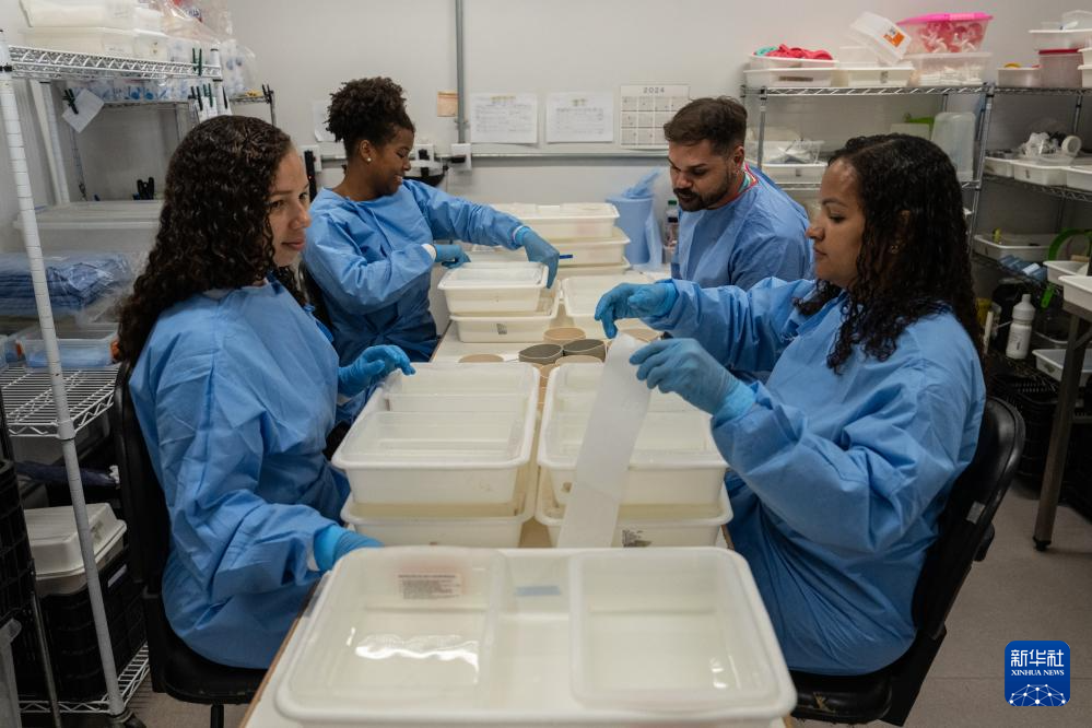 5月14日,在巴西里约热内卢奥斯瓦尔多·克鲁兹基金会的生物工厂内,工作人员观察携带沃尔巴克氏菌的埃及伊蚊虫卵。 巴西卫生部14日更新的数据显示,今年巴西共报告登革热病例超过470万例,该数字包括确诊和疑似病例,死亡病例超过2500例,为该国有疫情记录以来的最高水平。 奥斯瓦尔多·克鲁兹基金会是巴西卫生部下属的一家生物医学研究机构。该基金会在巴西里约热内卢马累建有一家小型生物工厂,培育携带沃尔巴克氏菌的埃及伊蚊。沃尔巴克氏菌是一种存在于自然界60%昆虫中的细胞内微生物,但在埃及伊蚊中并不常见。一旦携带沃尔巴克氏菌的蚊子释放到野外环境中,它们将通过繁殖,让更多蚊子携带上沃尔巴克氏菌。沃尔巴克氏菌存在于这些蚊子体内,会阻止包括登革热在内的多种病毒在蚊子体内的发展,有助于减少这些疾病的传播。 新华社记者 王天聪 摄