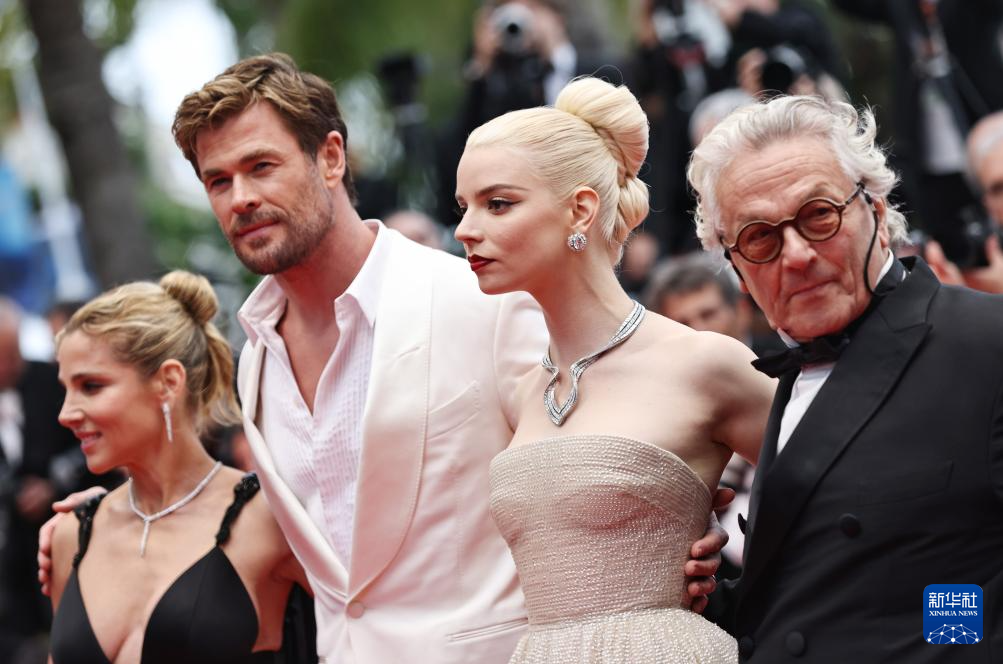 5月15日,在法国南部小城戛纳举行的第77届戛纳国际电影节上,影片导演乔治·米勒(右一)、主演安雅·泰勒-乔伊(右二)和克里斯·海姆斯沃斯(左二)出席非竞赛单元影片《疯狂的麦克斯:狂暴女神》首映礼。