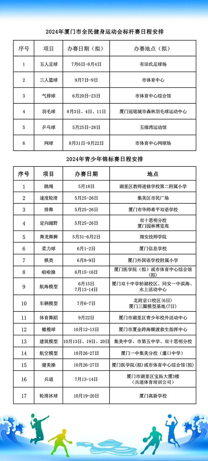 在当天举行的新闻发布会上,厦门市体育局透露,今年全民健身运动会以“龙腾鹭岛乐动厦门”为主题,于今年5月至10月陆续在全市各区举办。