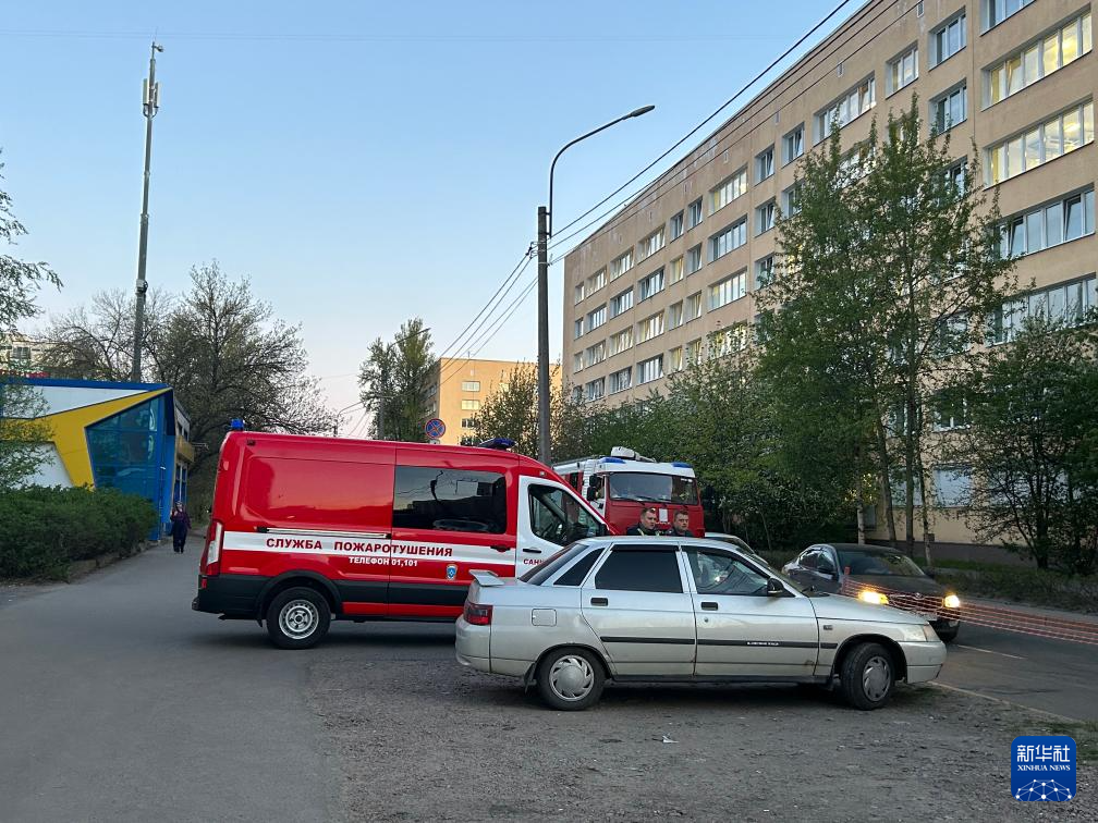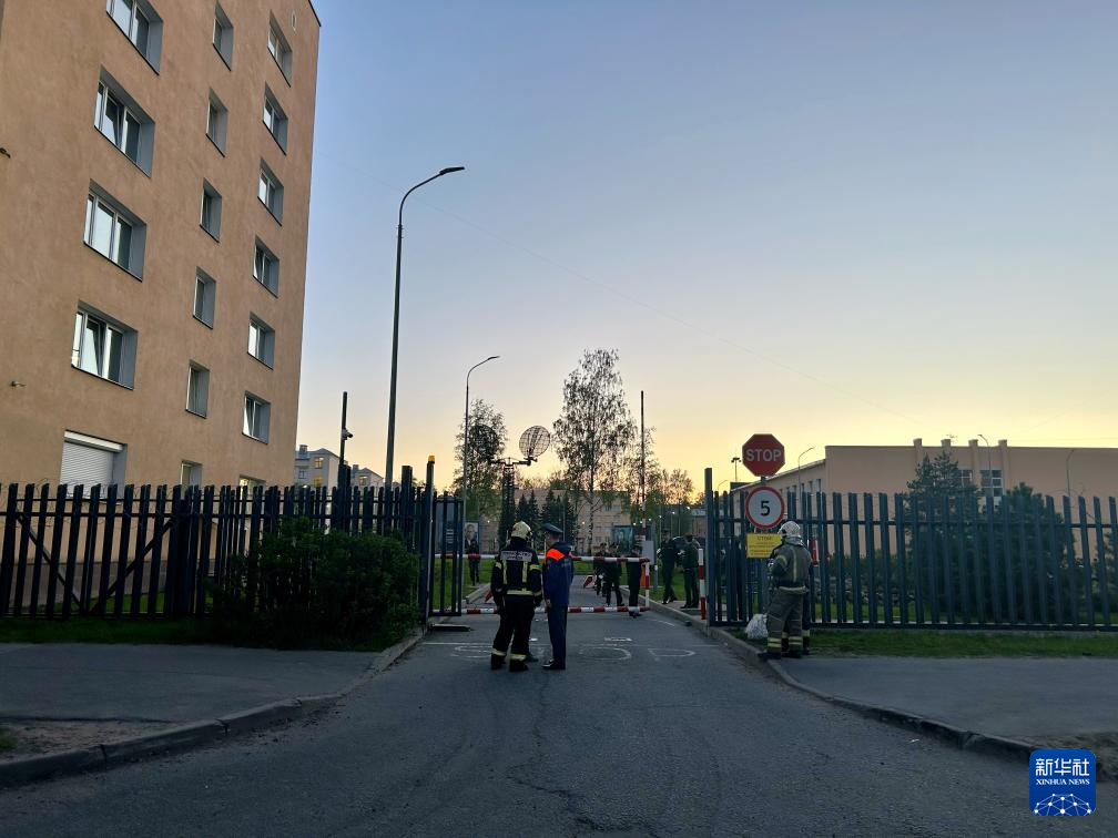 5月17日,消防车停在俄罗斯北部城市圣彼得堡布琼尼军事通信学院附近(手机照片)。