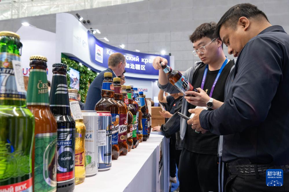 5月20日,在第八届中俄博览会现场,参观者选购俄罗斯啤酒。
