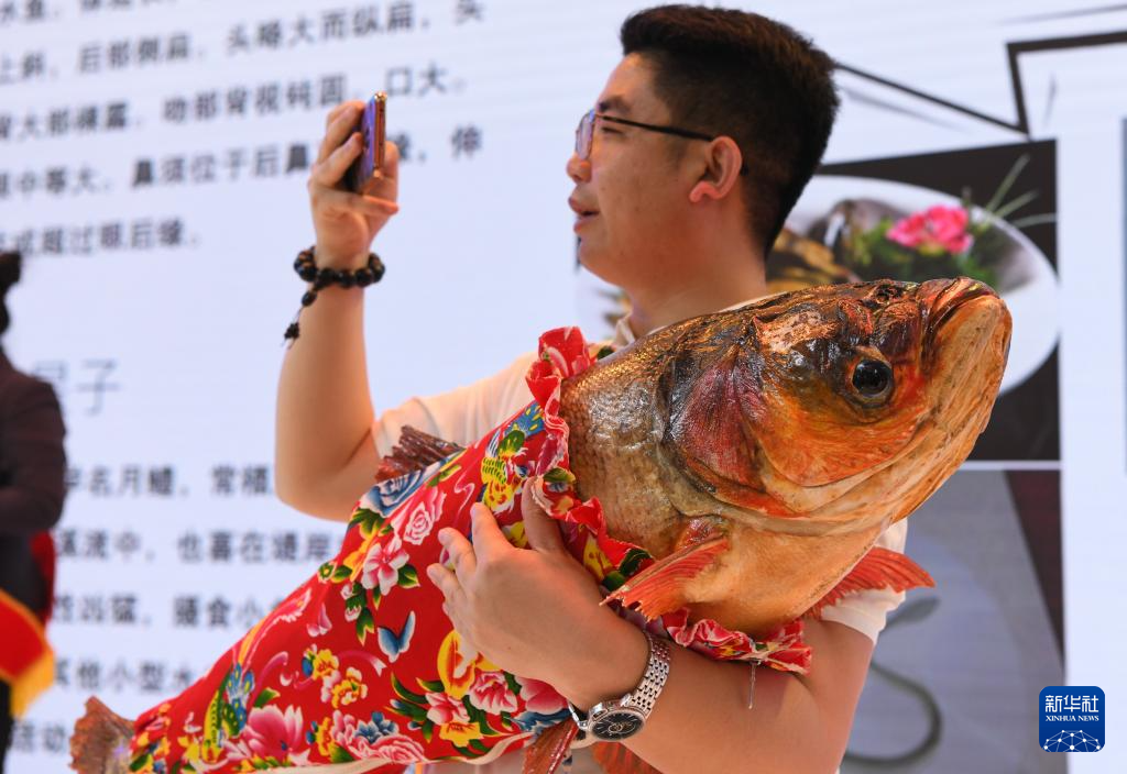 5月20日,在第八届中俄博览会上,参会人员展示从黑龙江、松花江、乌苏里江三江汇流处捕捞的胖头鱼。