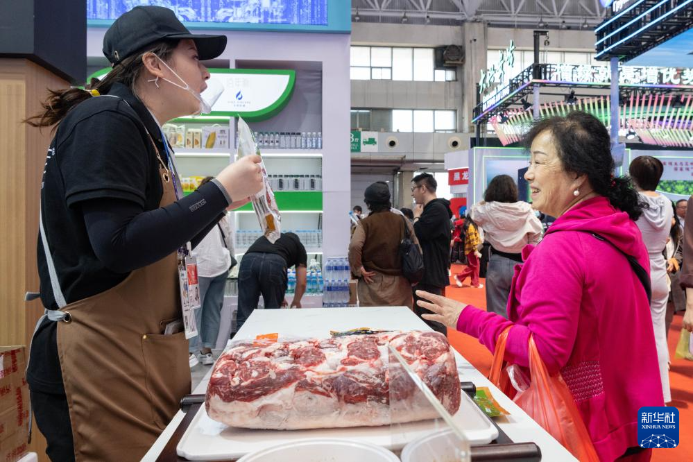 5月20日,在第八届中俄博览会现场,工作人员向参观者介绍来自黑龙江齐齐哈尔的牛肉。