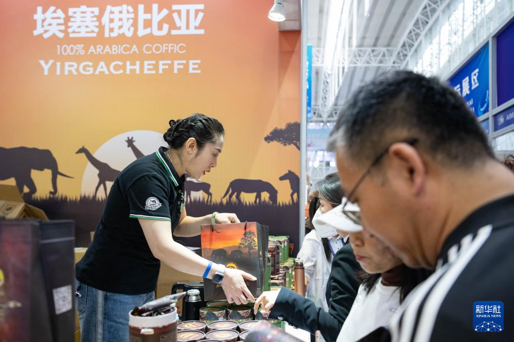 5月20日,在第八届中俄博览会现场,参观者在埃塞俄比亚展区选购食品。