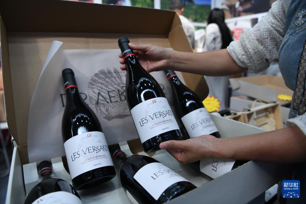 5月20日,在第八届中俄博览会上,参会人员展示一款法国的红酒。