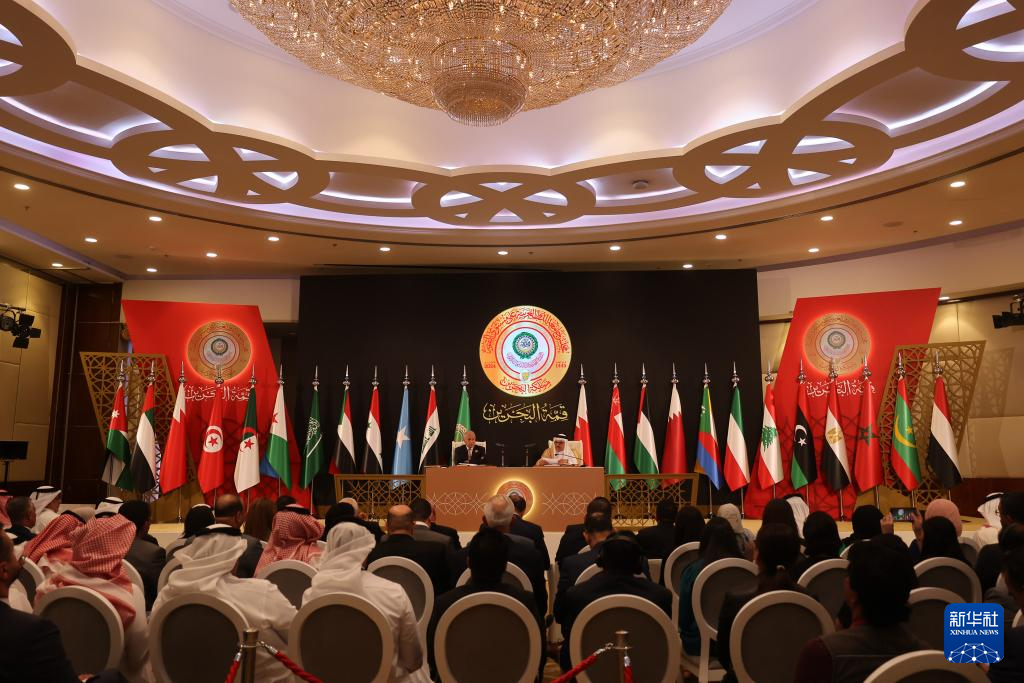 第33届阿盟峰会呼吁实现“两国方案” 这是5月16日在巴林麦纳麦拍摄的第33届阿盟峰会闭幕后举办的新闻发布会现场。 第33届阿拉伯国家联盟首脑理事会会议(阿盟峰会)16日下午在巴林首都麦纳麦闭幕。会后发表了《巴林宣言》,呼吁国际社会承担起推动中东和平进程的责任,在“两国方案”基础上实现地区公正、全面的和平。 新华社记者 王海洲 摄