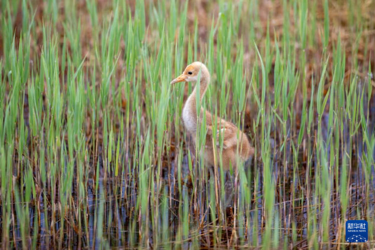 这是5月21日拍摄的扎龙国家级自然保护区内的一只雏鹤。