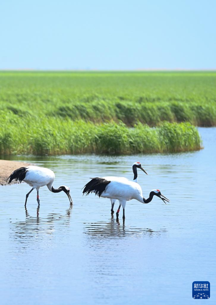 5月21日,在扎龙国家级自然保护区,丹顶鹤在水中觅食。