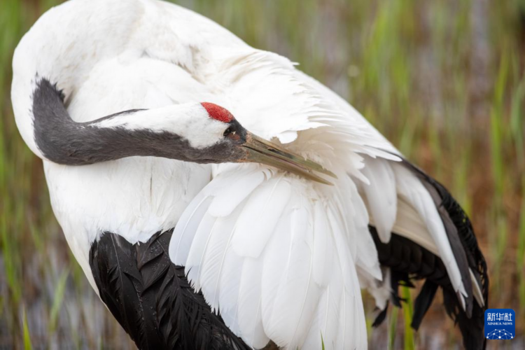 5月21日,在扎龙国家级自然保护区,丹顶鹤在整理翅膀羽毛。